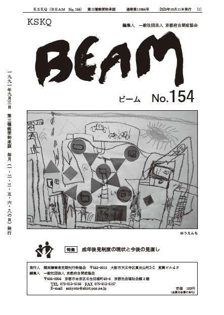 HOME>BEAM BEAM 2025.09.24 BEAM 【BEAM.154】成年後見制度の現状と今後の見直し 2025.05.10 BEAM 【BEAM.153】自閉スペクトラム症セミナーin きょうと 2024 2025.01.25 BEAM 【BEAM.152】自閉スペクトラム症の家族が知っておくべき制度について 2024.09.17 BEAM 【BEAM.151】 防災について 2024.05.18 BEAM 【BEAM.150】 自閉スペクトラム症セミナーin きょうと 2023 2024.01.29 BEAM 【BEAM.149】 コロナ禍の3年間を体験して 2023.09.01 BEAM 【BEAM.148】 健康・医療について 2023.05.10 BEAM 【BEAM.147】 高機能自閉症・アスペルガー症候群セミナー| 基調講演 元気になれる前向き子育て 1/3123 一般社団法人 京都府自閉症協会について ABOUT AUTISM SOCIETY OF KYOTO 自閉スペクトラム症をご存じですか? ASD(自閉スペクトラム症・アスペルガー症候群)は特徴のひとつです。 一般社団法人 京都府自閉症協会とは 京都府自閉症協会は親同士がつながり親と専門家が協働して活動しています。 事務局 京都府自閉症協会の裏方として様々な活動のサポートをしてます。 専門部 講演会やセミナーの企画、各活動への協力を行っています。 編集部 機関紙「BEAM」の発行や必要に応じた取材をしています。 幼児学齢部 高校3年生までのお子さんをお持ちのご家族を対象としています。 青年成人部 高校生以上のお子さんをお持ちのご家族を対象としています。 きょうだい部 学習会や交流会など、きょうだい支援のための活動を行っています。 父親ネットワーク 学習会の開催や情報交換、レクリエーションなど父親同士の交流を持てるように活動しています。 高機能・アスペルガー部 高機能タイプの子の保護者の交流会・学習会を中心に活動しています。 Kirala(キララ)本人の余暇活動 ダンスや音楽を楽しむ青年成人部のレクリエーション・TEACCHプログラムを取り入れた活動 The BEAT(We Love Music!!)本人の余暇活動 リズムや合奏を楽しむ音楽サークル・年齢を問わない会員限定の活動